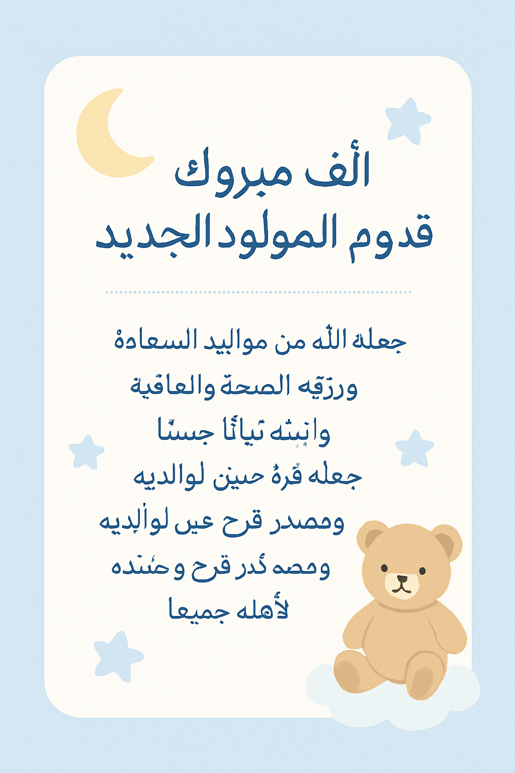 ألف مبروك قدوم المولود الجديد ( ) جعله الله من مواليد السعادة، ورزقه الصحة والعافية، وأنبته نباتًا حسنًا، وجعله قرة عينٍ لوالديه، ومصدر فرحٍ وسعادةٍ لأهله جميعًا