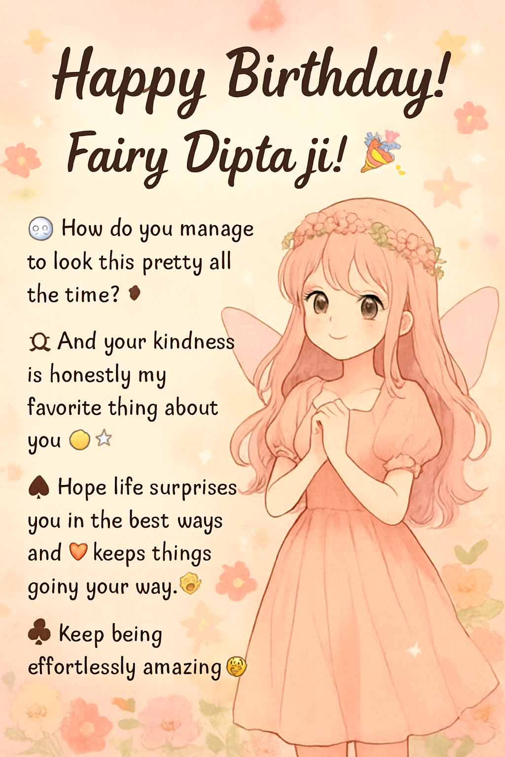 Happy Birthday! Fairy Dipta ji🎉 😶🌫️How do you manage to look this pretty all the time?♦ ΩAnd your kindness is honestly my favorite thing about you 🙂↔️ ♠Hope life surprises you in the best ways and ♥keeps things going your way.🤗 ♣Keep being effortlessly amazing🥳