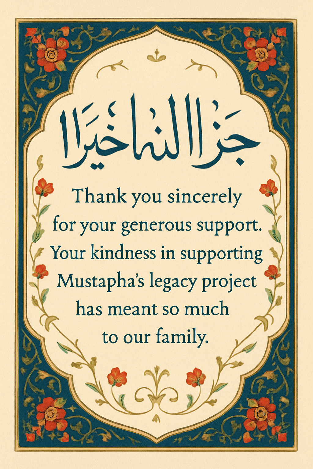 Thank you sincerely for your generous support. Your kindness in supporting Mustapha’s legacy project has meant so much to our family.