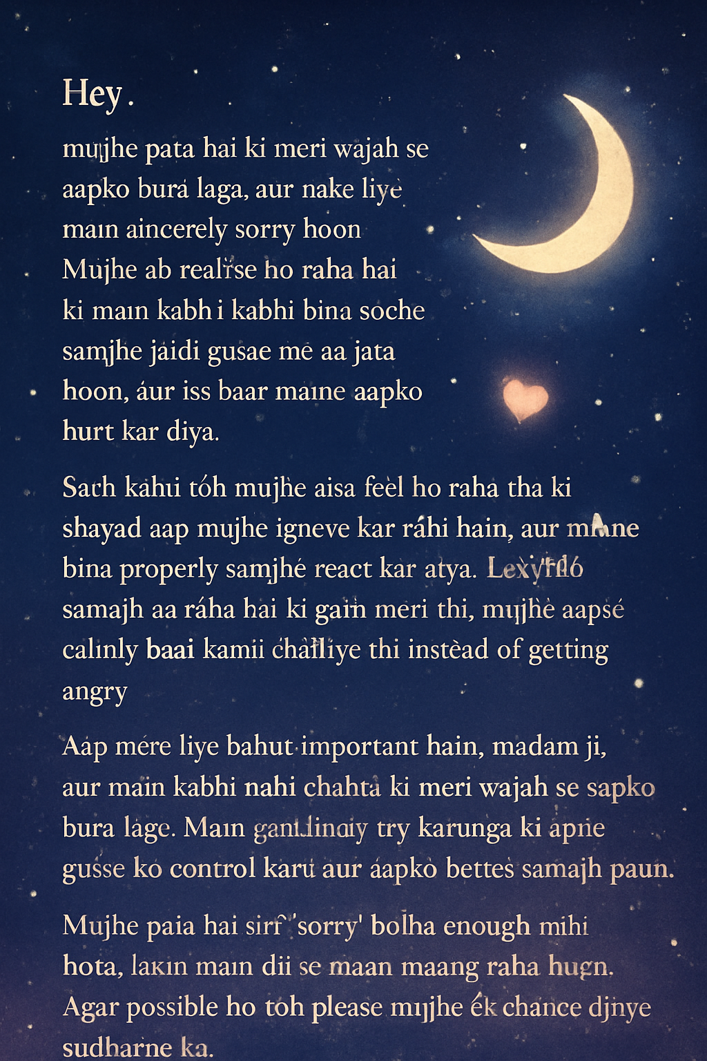 “Hey… mujhe pata hai ki meri wajah se aapko bura laga, aur uske liye main sincerely sorry hoon. Mujhe ab realize ho raha hai ki main kabhi-kabhi bina soche samjhe jaldi gusse me aa jata hoon, aur iss baar maine aapko hurt kar diya. Sach kahu toh mujhe aisa feel ho raha tha ki shayad aap mujhe ignore kar rahi hain, aur maine bina properly samjhe react kar diya. Lekin ab samajh aa raha hai ki galti meri thi, mujhe aapse calmly baat karni chahiye thi instead of getting angry. Aap mere liye bahut important hain, madam ji, aur main kabhi nahi chahta ki meri wajah se aapko bura lage. Main genuinely try karunga ki apne gusse ko control karu aur aapko better samajh paun. Mujhe pata hai sirf ‘sorry’ bolna enough nahi hota, lekin main dil se maafi maang raha hoon. Agar possible ho toh please mujhe ek chance dijiye sudharne ka. Main waise hi behave karna chahta hoon jaisa aap deserve karti hain. Aur sach me… agr Normal baat krna possible ho toh krte hai na