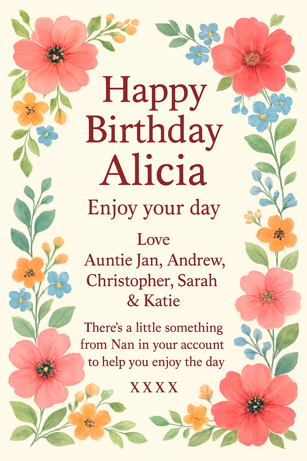 Happy Birthday Alicia Enjoy your day Love Auntie Jan, Andrew ,Christopher, Sarah & Katie There’s a little something from nan in your account to help you enjoy the day XXXXX