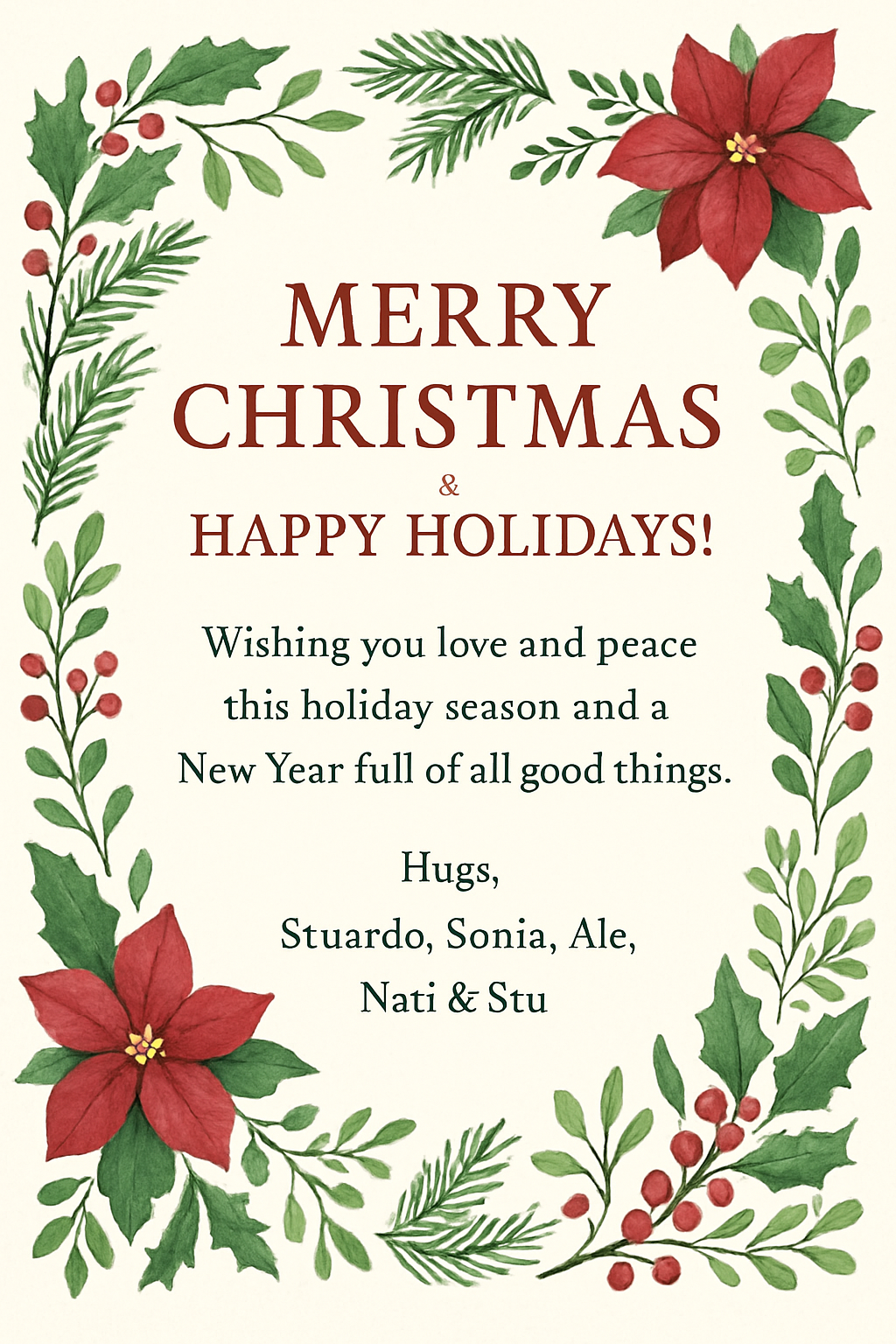 Merry Christmas & Happy Holidays! Wishing you love and peace this holiday season and a New Year full of all good things. Hugs, Stuardo, Sonia, Ale, Nati & Stu