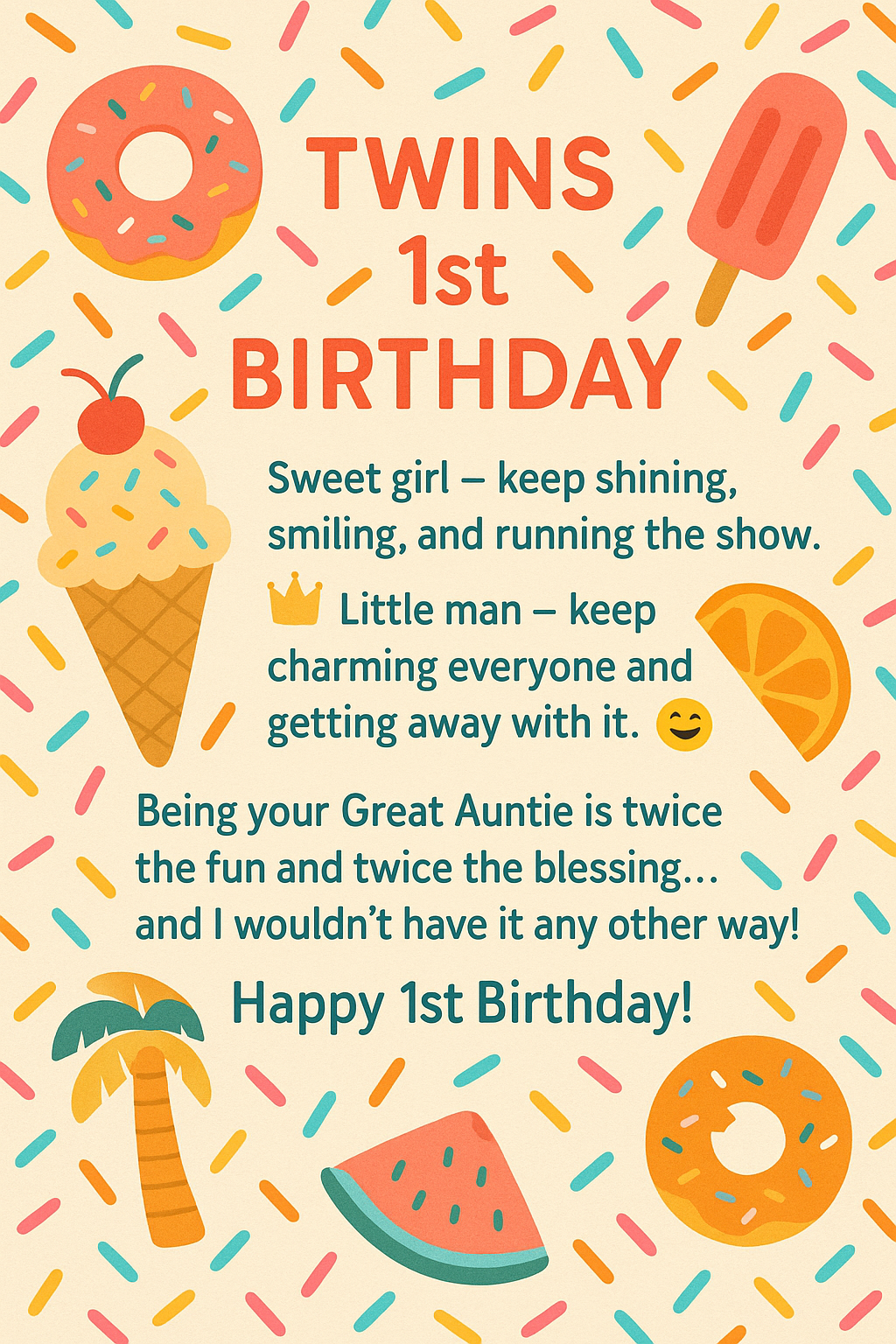 TWINS 1st BIRTHDAY Sweet girl — keep shining, smiling, and running the show. 👑 Little man — keep charming everyone and getting away with it. 😄 Being your Great Auntie is twice the fun and twice the blessing… and I wouldn’t have it any other way! Happy 1st Birthday!