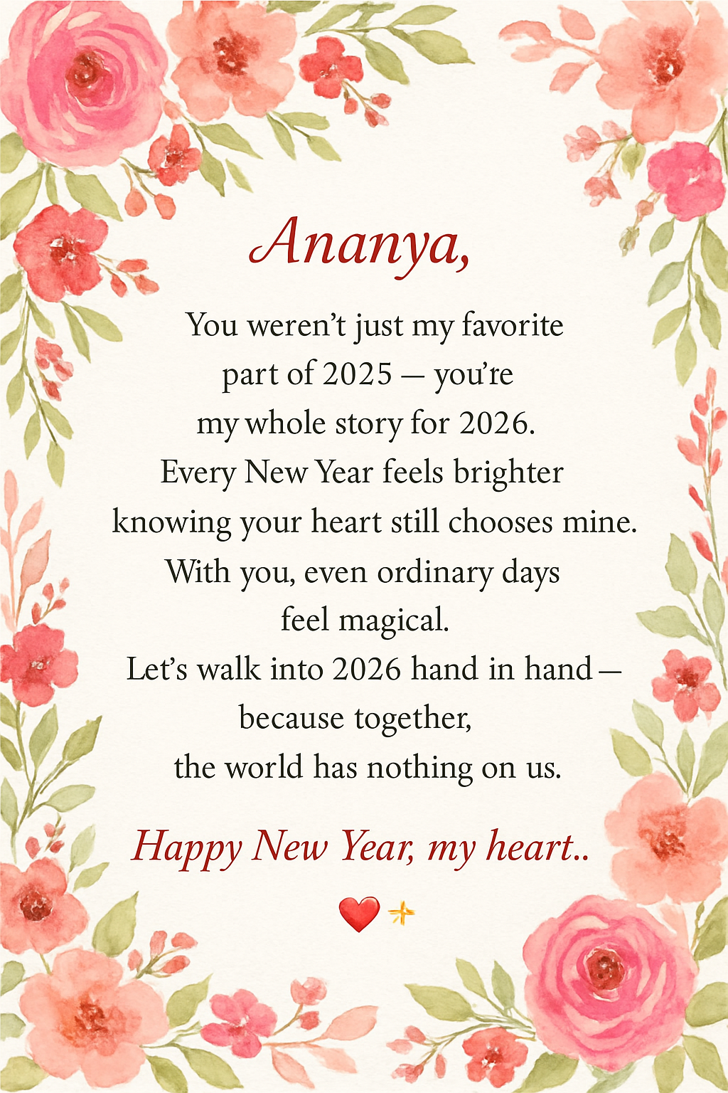 Ananya, You weren’t just my favorite part of 2025 — you’re my whole story for 2026. Every New Year feels brighter knowing your heart still chooses mine. With you, even ordinary days feel magical. Let’s walk into 2026 hand in hand — because together, the world has nothing on us. ❤️✨ Happy New Year, my heart..💗 Click here :https://open.spotify.com/track/7zfWkmCBZkYLccY2LBo4YR?si=x_AV83wJTDarTnRtFsXzVw