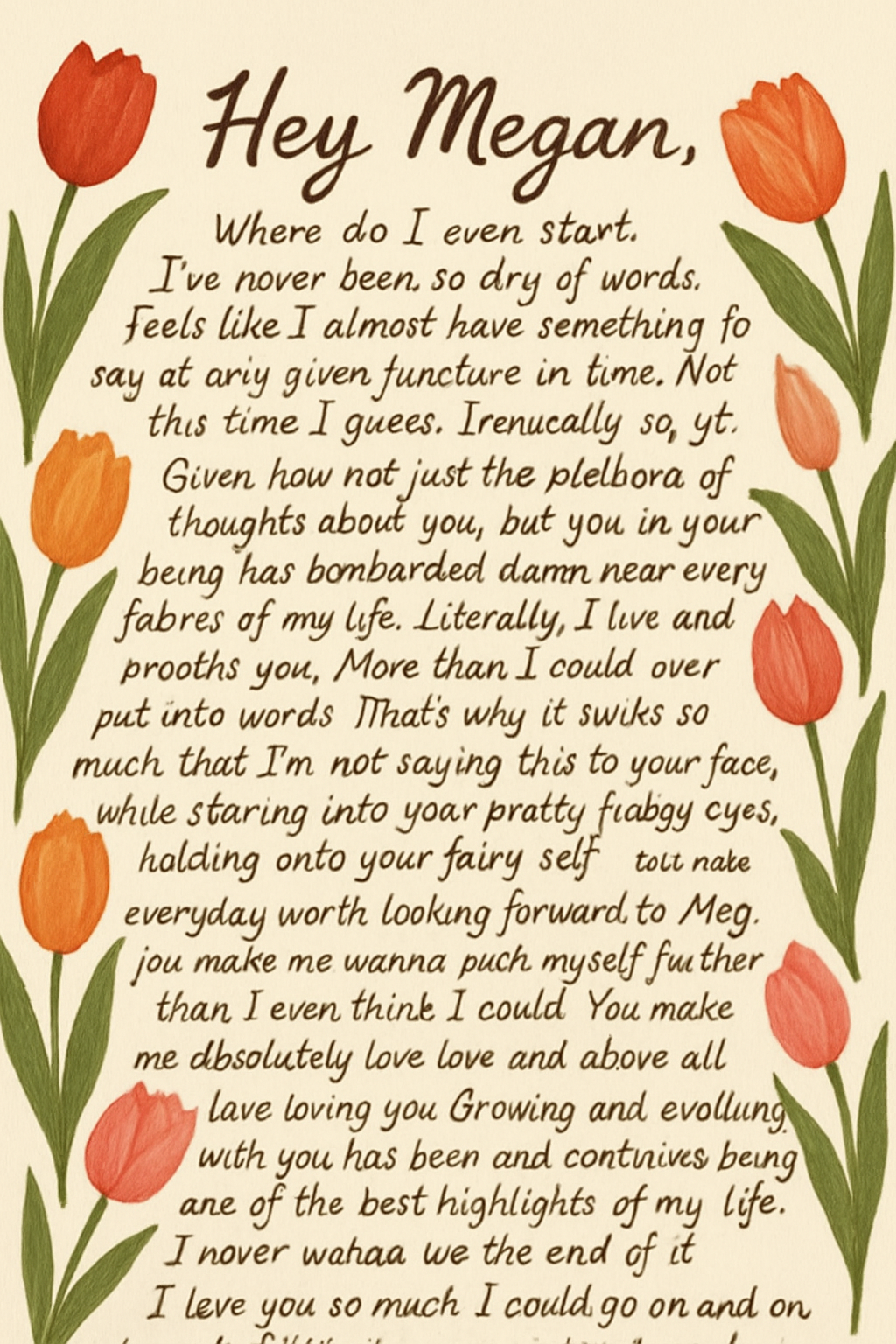 Hey Megan. Where do I even start. I’ve never been so dry of words. Feels like I almost have something to say at any given juncture in time. Not this time I guess. Ironically so, yk. Given how not just the plethora of thoughts about you, but you in your being has bombarded damn near every fabric of my life. Literally. I live and breathe you . More than I could ever put into words. That’s why it sucks so much that I’m not saying this to your face, while staring into your pretty fudgy eyes, holding onto your fairy self. You make everyday worth looking forward to, Meg. You make me wanna push myself further than I even think I could. You make me absolutely love love and above all, love loving you. Growing and evolving with you has been and continues being one of the best highlights of my life. I never wanna see the end of it. I love you so much. I could go on and on about it but I rather show you instead. And oh I will. Believe that.