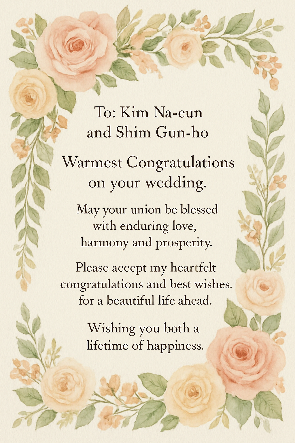 To: Kim Na-eun and Shim Gun-ho Warmest Congratulations on your wedding. May your union be blessed with enduring love, harmony and prosperity. Please accepts my heartfelt congratulations and best wishes for a beautiful life ahead. Wishing you both a lifetime of happiness
