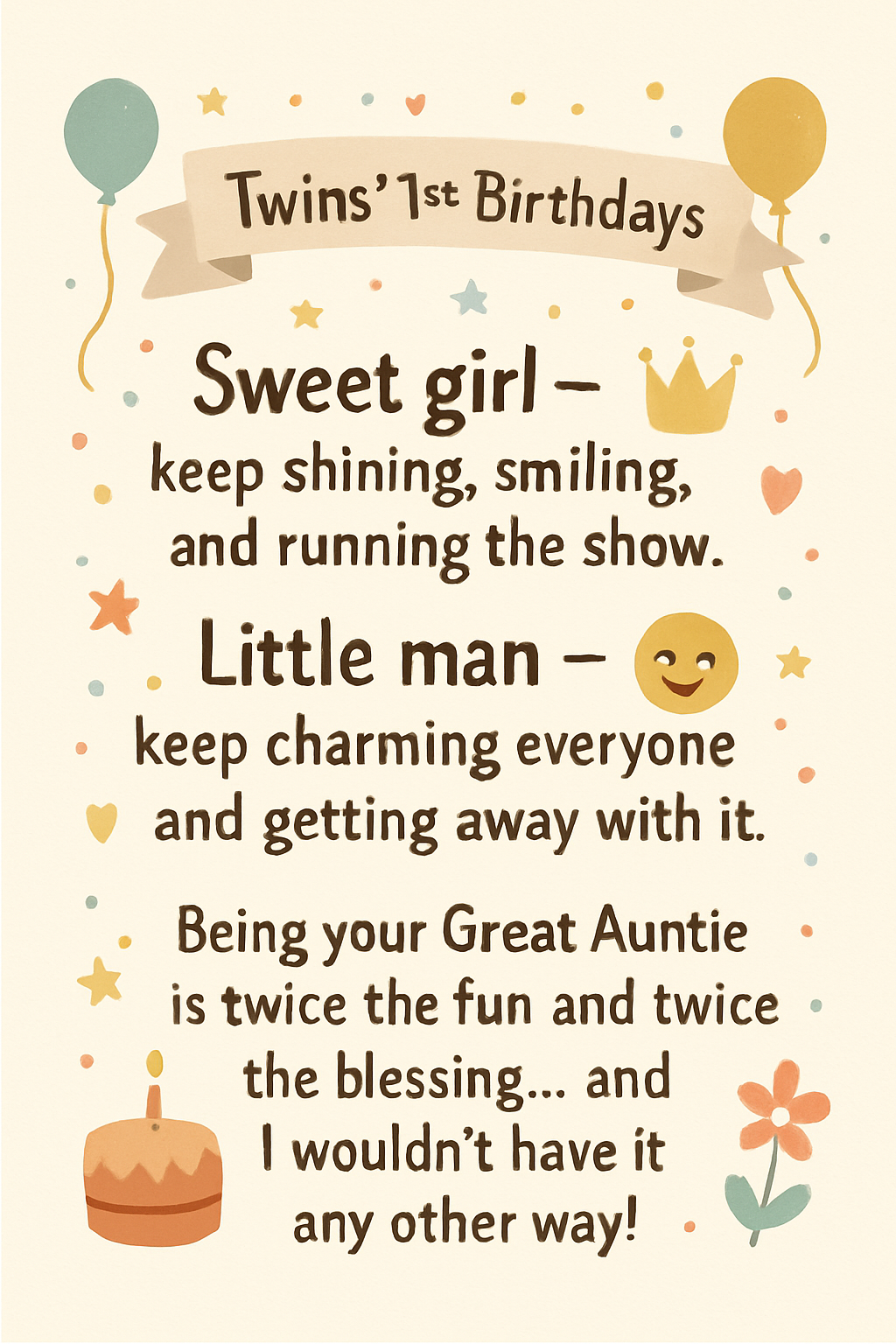 Sweet girl — keep shining, smiling, and running the show. 👑 Little man — keep charming everyone and getting away with it. 😄 Being your Great Auntie is twice the fun and twice the blessing… and I wouldn’t have it any other way!