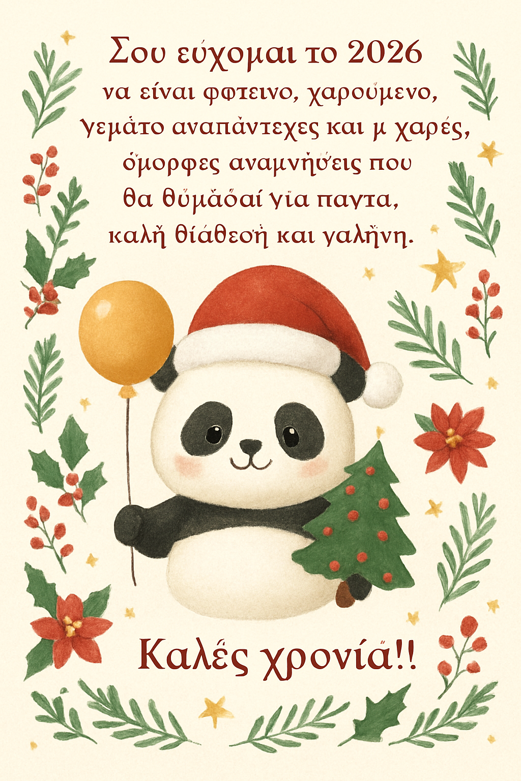 Σου εύχομαι το 2026 να είναι φωτεινό, χαρούμενο, γεμάτο αναπάντεχες και μη χαρές, όμορφες αναμνήσεις που θα θυμάσαι για πάντα, καλή διάθεση και γαλήνη. Καλ7 χρον7ά!!
