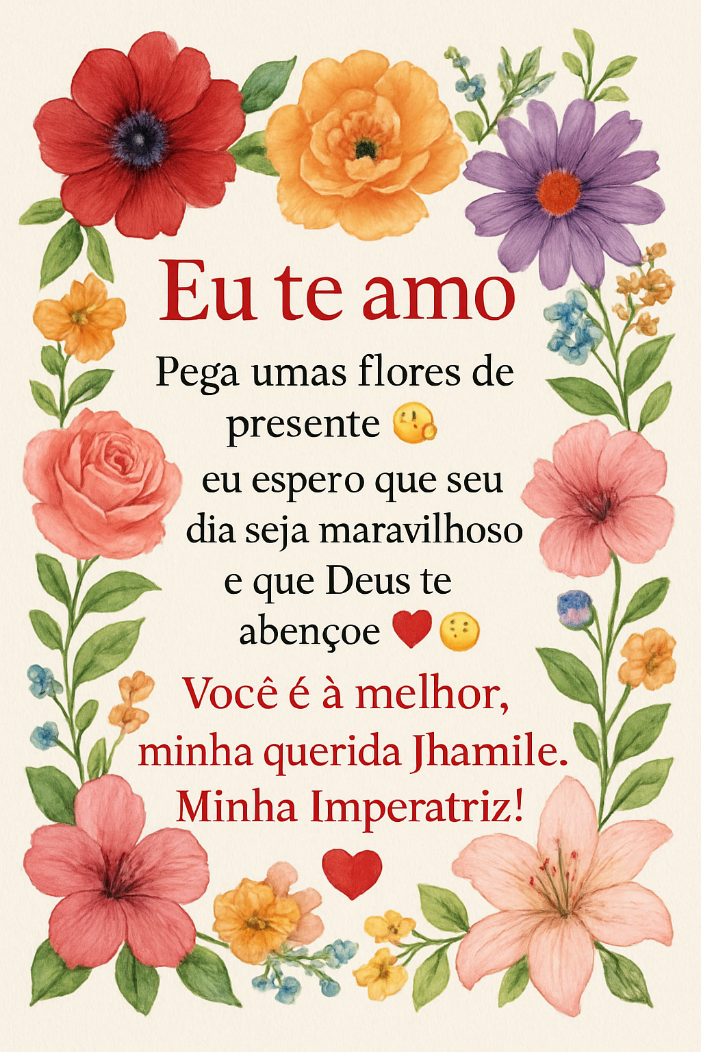 Eu te amo❤️ Pega umas flores de presente😘, eu espero que seu dia seja maravilhoso e que Deus te abençoe❤️😊 Você é a melhor, minha querida Jhamile. Minha Imperatriz!❤️