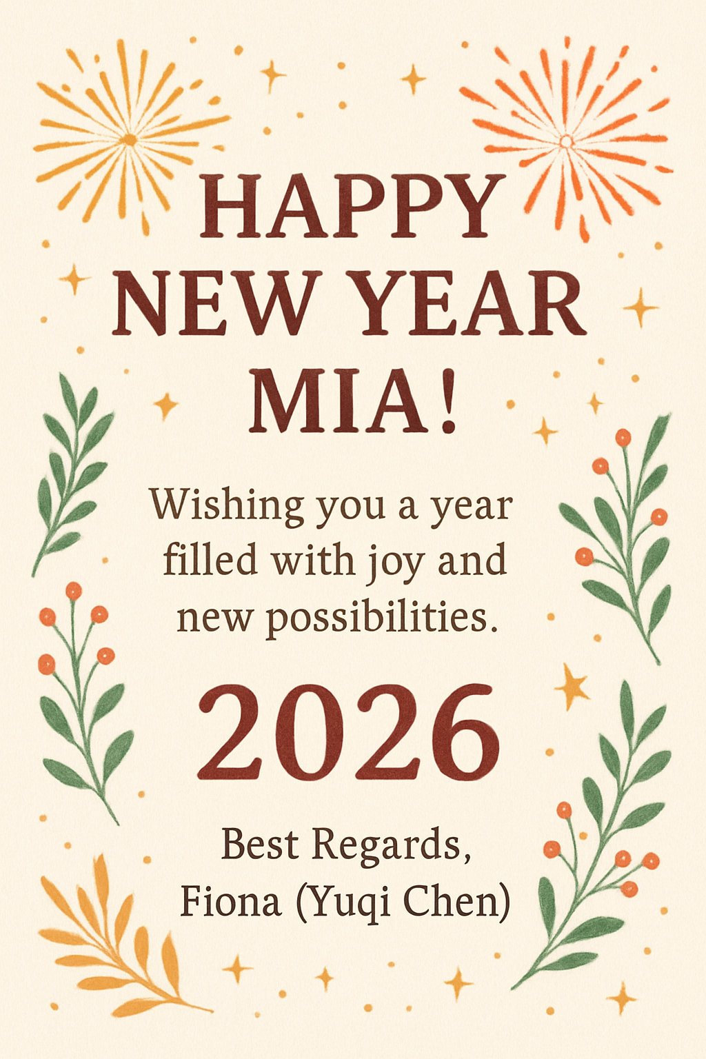 Happy new year, Mia! Wishing you a year filled with joy and new possibilities. Best Regards, Fiona (Yuqi Chen)
