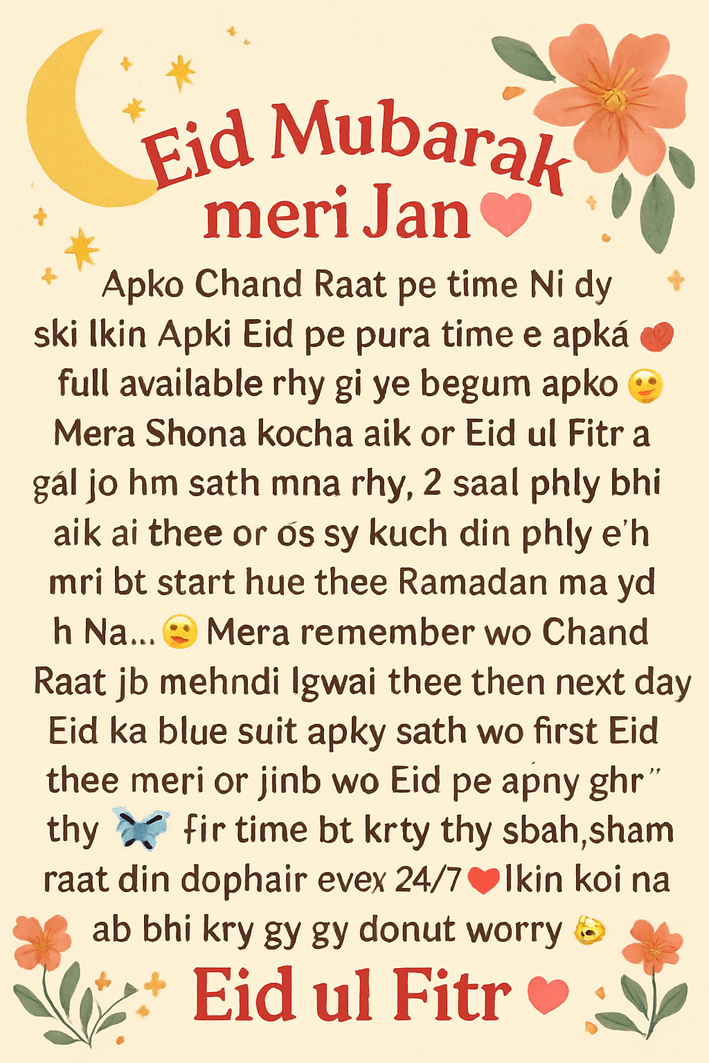 Eid Mubarak meri Jan 💗🫵🏻💐💋 Apko Chand Raat pe time Ni dy ski lkin Apki Eid pe pura time e apka full available rhy gi ye begum apko😘 Mera Shona kocha aik or Eid ul Fitr a gai jo hm sath mna rhy, 2 saal phly bhi aik ai thee or os sy kuch din phly e hmri bt start hue thee Ramadan ma yd h Na…😜🤭 Do u remember wo Chand Raat jb mehndi lgwai thee then next day Eid ka blue suit apky sath wo first Eid thee meri or jinb wo Eid pe apny ghr thy🦋🫶🏻 Hr time bt krty thy sbha sham raat din dophair even 24/7 💗💋lkin koi na ab bhi kry gy donut worry 😜 Bai ab ye likh tu rhi ho lkin pta Ni h ky ye hoga bhi ya Ni smj Ni lg rhi thee ky Kia kesy wish kro tu phr mujy ye mila tu socha is pe try krti ho so just I’m trying