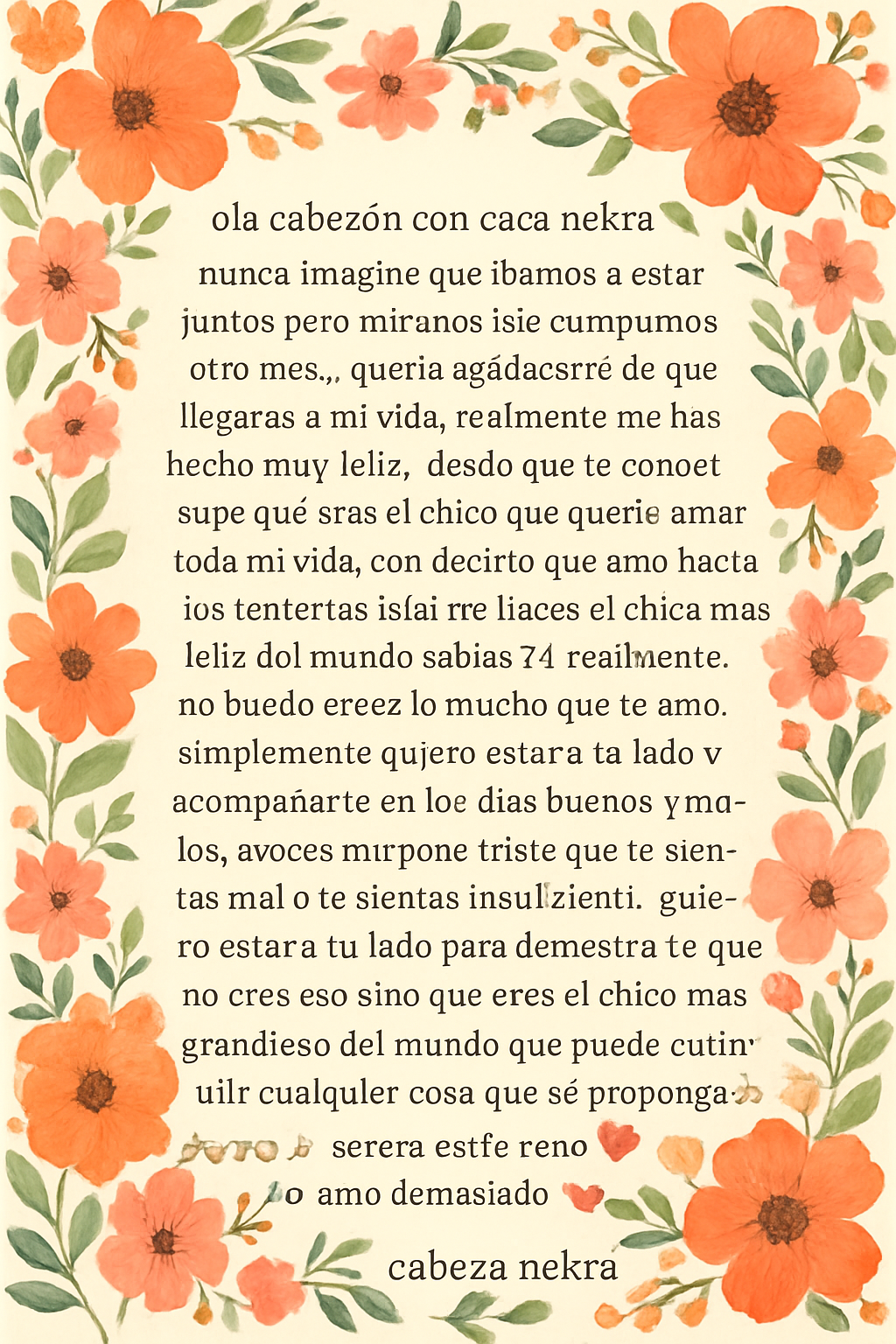 ola cabezón con cara nekra 🦕 nunca imaginé que íbamos a estar juntos pero míranos jsjs cumplimos otro mes.. quería agradecerte de que llegaras a mi vida, realmente me has hecho muy feliz.. desde que te conocí supe que eras el chico que quería amar toda mi vida, con decirte que amo hasta tus tonterías jsjsj me haces la chica más feliz del mundo sabías <3? realmente.. no puedo creer lo mucho que te amo, simplemente quiero estar a tu lado y acompañarte en los días buenos y malos, aveces me pone triste que te sientas mal o te sientas insuficiente, quiero estar a tu lado para demostrarte que no eres eso sino que eres el chico más grandioso del mundo que puede cumplir cualquier cosa que se proponga :3 créelo si? ❤️🩹 yo te estaré esperando para por fin llegar a tus brazos y no soltarte nunca más jsjsj lo prometo,quiero pasar toda mi vida a tu lado, quiero envejecer a tu lado, aveces pensaba que no quería quedar vieja JAKDJD pero ahora que estás aquí quiero eso ya que si estaría contigo así significaría que estuve toda mi vida a tu lado :3 sería increíble no crees? jsksj cabezón te amo demasiado vale? a pesar de la distancia mi amor es más grande que esa distancia sabes? quiero crecer a tu lado :³ y buenop sabes que te amo mucho mucho y quiero que sigamos así porque realmente te amo demasiado tonto ❤️🩹 cabeza nekra