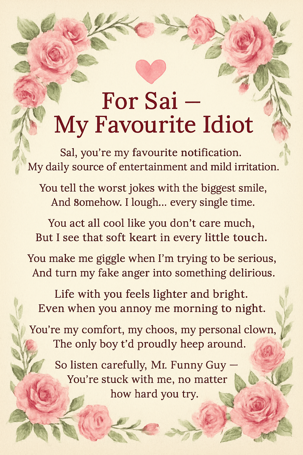 💕 For Sai – My Favourite Idiot Sai, you’re my favourite notification, My daily source of entertainment and mild irritation. You tell the worst jokes with the biggest smile, And somehow I laugh… every single time. You act all cool like you don’t care much, But I see that soft heart in every little touch. You make me giggle when I’m trying to be serious, And turn my fake anger into something delirious. Life with you feels lighter and bright, Even when you annoy me morning to night. You’re my comfort, my chaos, my personal clown, The only boy I’d proudly keep around. So listen carefully, Mr. Funny Guy — You’re stuck with me, no matter how hard you try. Because behind all the teasing and silly stuff I do, Is a girl who is completely in love with you. 💖