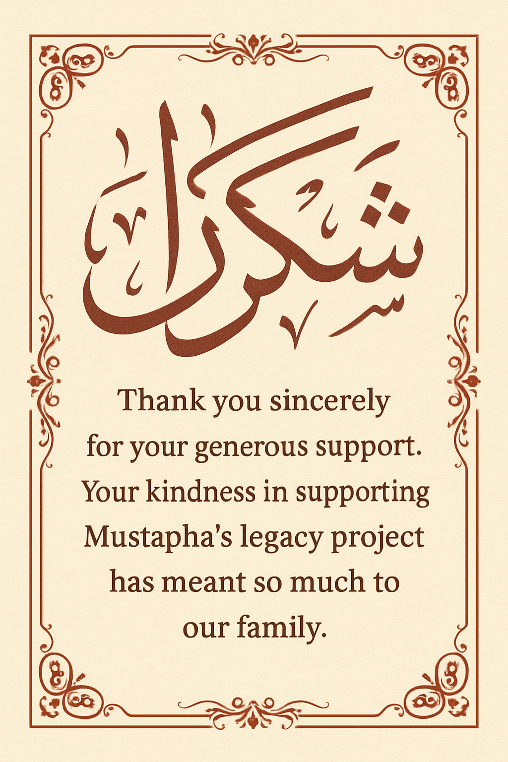 Thank you sincerely for your generous support. Your kindness in supporting Mustapha’s legacy project has meant so much to our family.