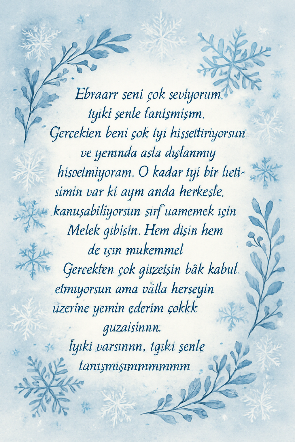 Ebraarr seni cook seviyorumm iyiki senle tanismisimm.Gercekten beni cook iyi hissettiriyorsun ve yanında asla dışlanmış hissetmiyorum.O kadar iyi bir iletişimin var ki aynı anda herkesle konuşabiliyorsun sırf üzmemek içinn.Melek gibisinn.Hem dışın hem de için mükemmel.Gerçektenn cokk güzelsin bak kabul etmiyosun ama valla herşeyin üzerine yemin ederim çokkk güzelsinnn.İyiki varsınnn iyiki senle tanışmışımmmmmmmmmm