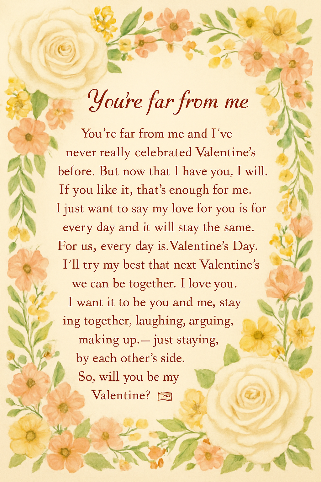 You’re far from me and I’ve never really celebrated Valentine’s before. But now that I have you, I will. If you like it, that’s enough for me. I just want to say my love for you is for every day and it will stay the same. For us, every day is Valentine’s Day. I’ll try my best that next Valentine’s we can be together. I love you. I want it to be you and me, staying together, laughing, arguing, making up — just staying by each other’s side. So, will you be my Valentine? 💌