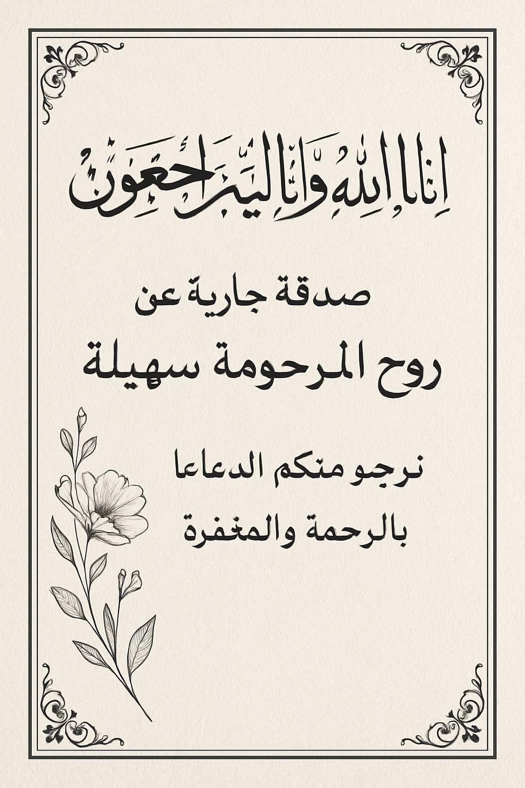 إنا لله وإنا إليه راجعون صدقة جارية عن روح المرحومة سهيلة نرجو منكم الدعاء لها بالرحمة والمغفرة