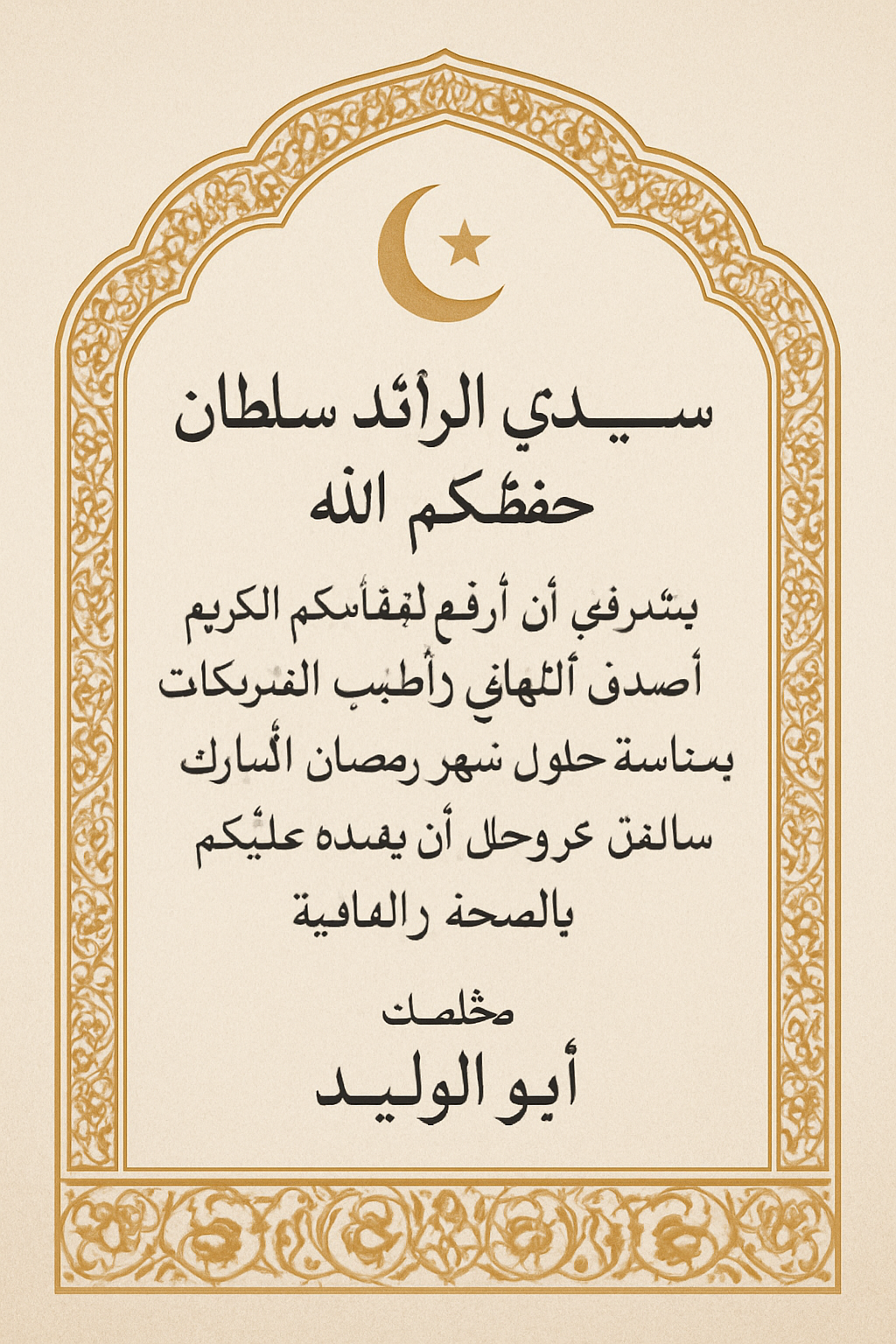 سيدي الرائد سلطان حفظكم الله. يشرّفني أن أرفع لمقامكم الكريم أصدق التهاني وأطيب التبريكات بمناسبة حلول شهر رمضان المبارك سائلًا المولى عزّ وجل أن يعيده عليكم بالصحة والعافية. مخلصك أبو الوليد