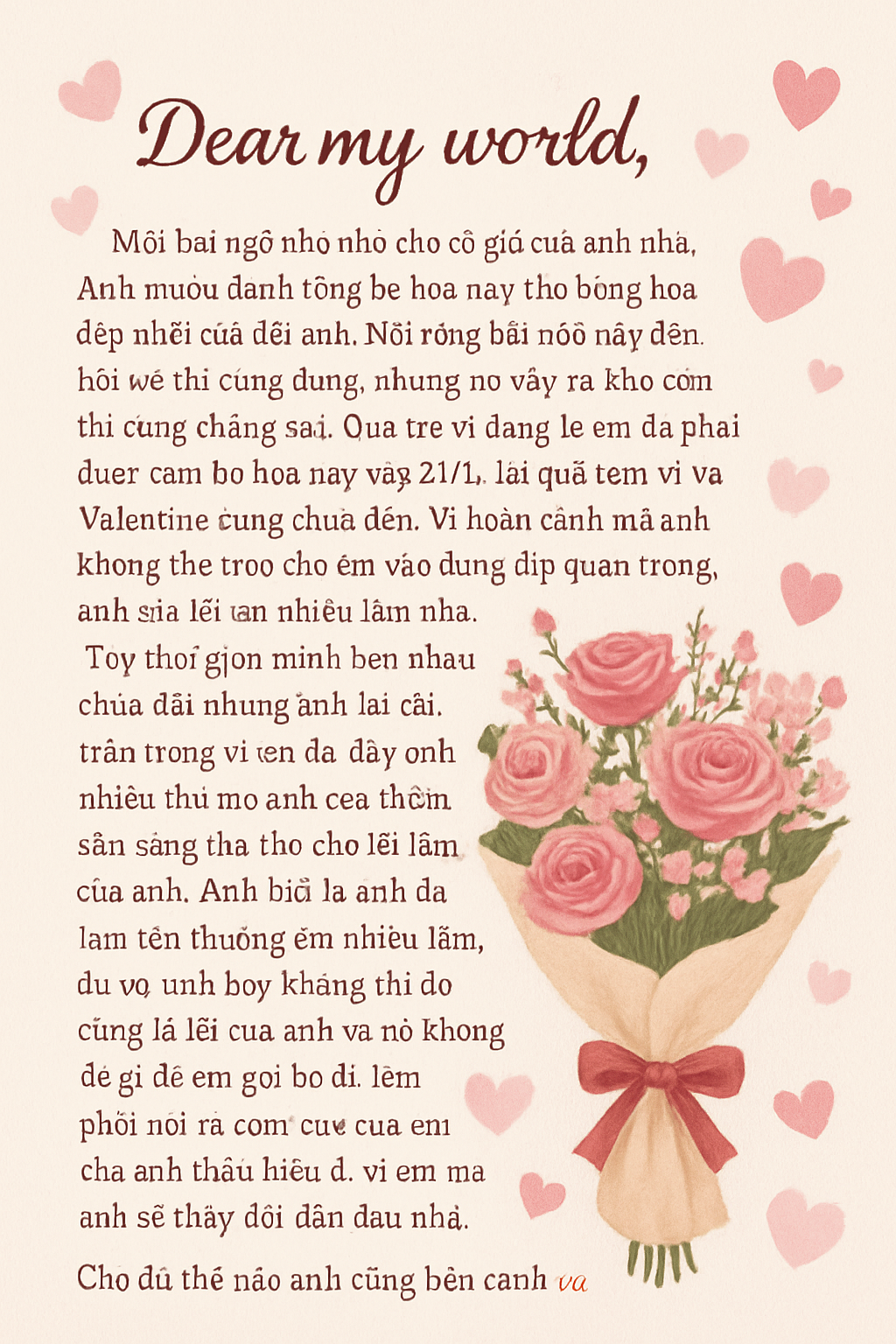 Dear my world, Một bất ngờ nho nhỏ cho cô gái của anh nha. Anh muốn dành tặng bó hoa này cho bông hoa đẹp nhất của đời anh. Nói rằng bất ngờ này đến hơi trễ thì cũng đúng, nhưng nó xảy ra khá sớm thì cũng chẳng sai. Quá trễ vì đáng lẽ em đã phải được cầm bó hoa này vào 31/1, lại quá sớm vì Valentine cũng chưa đến, vì hoàn cảnh mà anh không thể trao cho em vào đúng dịp quan trọng, anh xin lỗi em nhiều lắm nha. Tuy thời gian mình bên nhau chưa dài nhưng anh lại rất trân trọng vì em đã dạy anh nhiều thứ mà anh còn thiếu, sẵn sàng tha thứ cho lỗi lầm của anh. Anh biết là anh đã làm tổn thương em nhiều lắm, dù vô tình hay không thì đó cũng là lỗi của anh và nó không dễ gì để em gạt bỏ đi. Em phải nói ra cảm xúc của em cho anh thấu hiểu á, vì em mà anh sẽ thay đổi dần dần nha. Cho dù thế nào anh cũng bên cạnh và che chở em hết, mệt thì cứ tìm anh mà dựa vào nha. BEO YÊU BON!