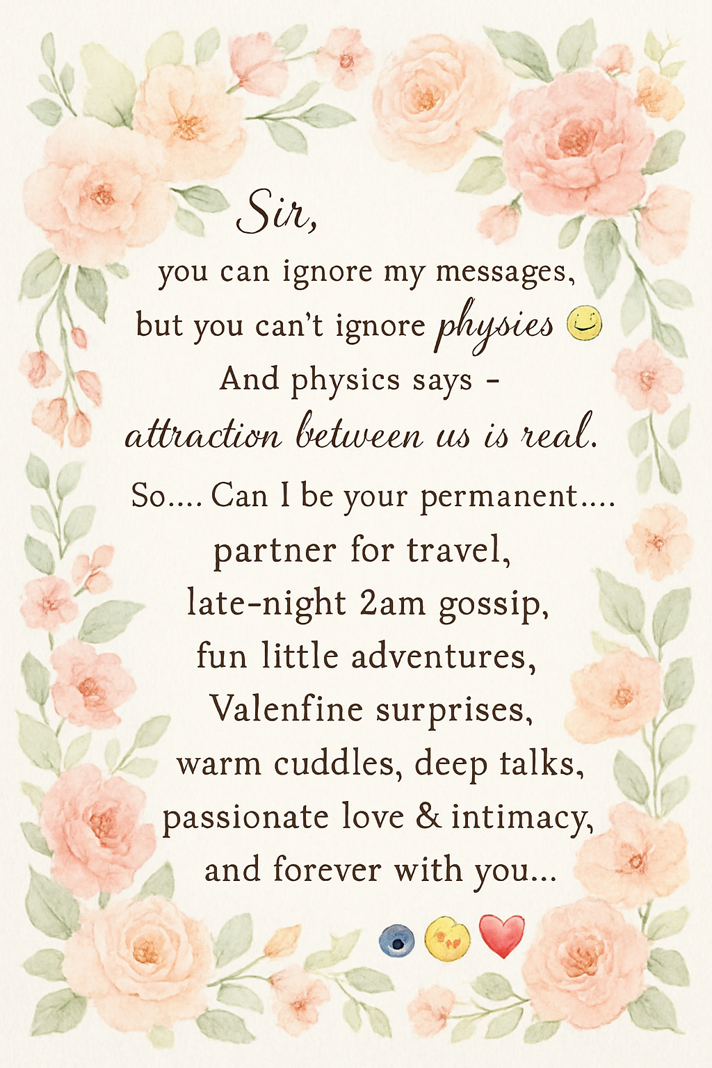Sir, you can ignore my messages, but you can’t ignore physics 😏 And physics says — attraction between us is real. So… Can I be your permanent....... partner for travel, late-night 2am gossip, fun little adventures, Valentine surprises, warm cuddles, deep talks, passionate love & intimacy, and forever with you..🧿❤️😘❤️