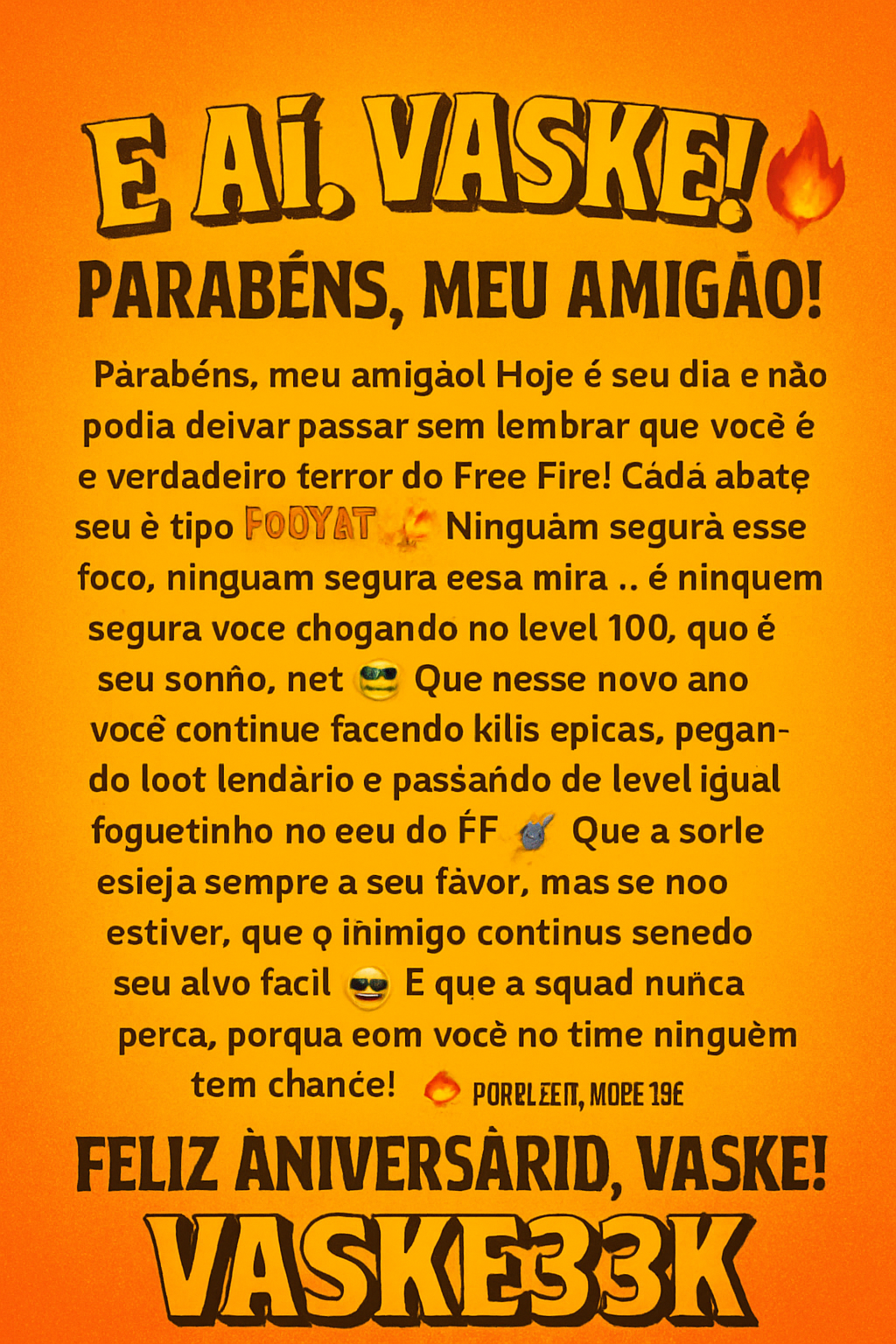 E aí, Vaske! 🎮🔥 Parabéns, meu amigão! Hoje é seu dia e não podia deixar passar sem lembrar que você é o verdadeiro terror do Free Fire! Cada abate seu é tipo BOOYAH! 💥 Ninguém segura esse foco, ninguém segura essa mira… e ninguém segura você chegando no level 100, que é seu sonho, né? 😎 Que nesse novo ano você continue fazendo kills épicas, pegando loot lendário e passando de level igual foguetinho no céu do FF 🚀. Que a sorte esteja sempre a seu favor, mas se não estiver, que o inimigo continue sendo seu alvo fácil 😂. E que a squad nunca perca, porque com você no time ninguém tem chance! Feliz aniversário, Vaske! Que sua vida seja tão épica quanto suas partidas e que seus abates na vida real também sejam lendários! 🏆🎂