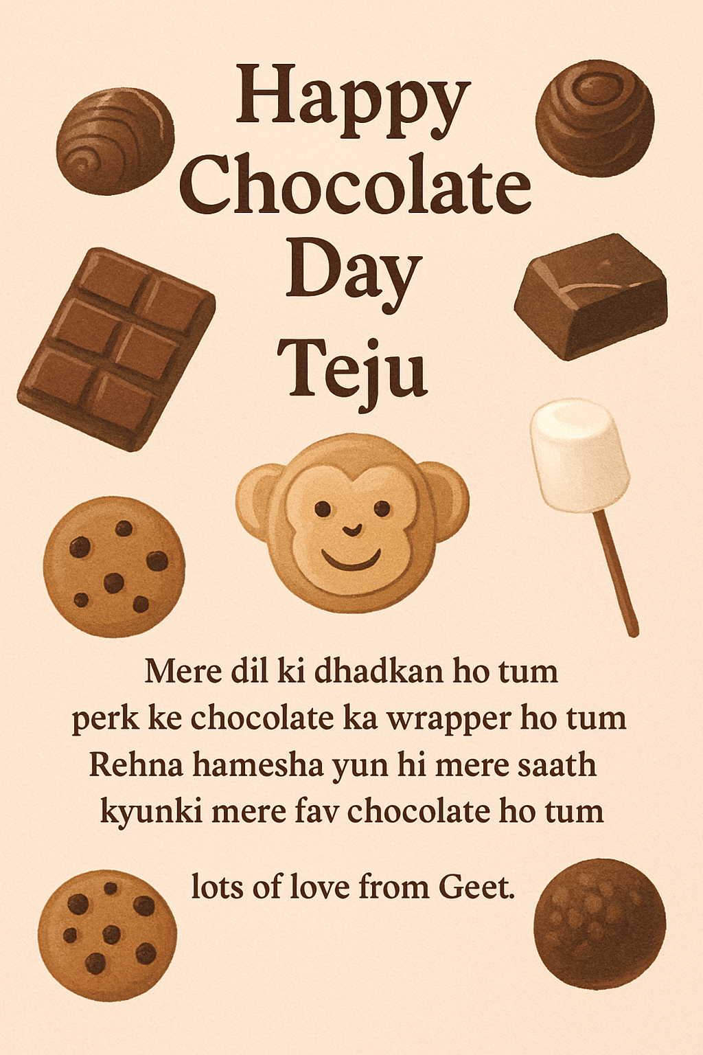 card written Happy Chocolate Day Teju in middle and then pics of chocolates with a monkey cookies and marshmallow... at the end write this Mere dil ki dhadkan ho tum perk ke chocolate ka wrapper ho tum Rehna hamesha yun hi mere saath kyuki mere fav chocolate ho tum. lots of love from Geet